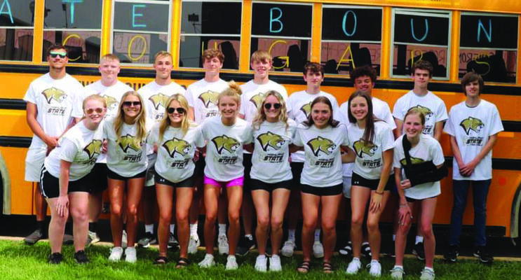 Highland Boys and Girls State Track Team-From Left to Right, Front Row: Brylee Whiteaker, Summer Goings, Ella Wenneker, Morgan Keith, Ansley Bringer, Mikayla Dreyer, Ali Reed, and Addie Johnston. Back Row: Devin Stutsman, Shon Stark, Robert Goehl, Cameron Bringer, Drew Mallett, Kane Stegeman, Brandon Holder, Charlie Evans, and Ethan Clow